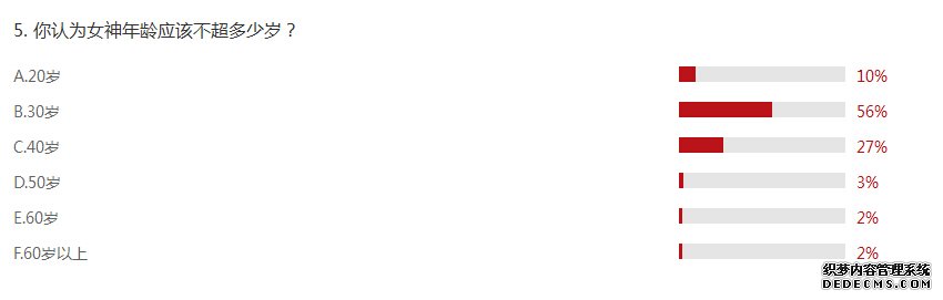 對(duì)于第五個(gè)問題,大家的意見也非常統(tǒng)一,也暴露出男生最真實(shí)的心理,66%網(wǎng)友表示女神年齡不應(yīng)超過30歲,其中10%的網(wǎng)友表示女神不應(yīng)超過20歲,也就是說一旦女性年齡超過30歲,就基本上與女神無緣了;當(dāng)然,也有一部分網(wǎng)友非常寬容,27%的網(wǎng)友表示女神不應(yīng)超過40歲,僅有3%網(wǎng)友表示女神不應(yīng)超過50歲,讓人欣慰的是,2%的網(wǎng)友表示女神不應(yīng)超過60歲。