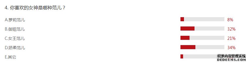 什么范兒的女神最受歡迎?這個(gè)問題的答案跟上一個(gè)基本上吻合,34%的網(wǎng)友喜歡嬌柔范兒;還有相當(dāng)比例的網(wǎng)友表示喜歡御姐范兒,這部分網(wǎng)友占到32%,與嬌柔范兒的女神有的一拼;21%的網(wǎng)友表示喜歡女王范兒,這個(gè)類型的女神估計(jì)等同于男神界的霸道總裁,要的就是一個(gè)氣勢(shì);還有8%網(wǎng)友表示喜歡蘿莉范兒的女神,咳咳,對(duì)這部分網(wǎng)友的偏好,我就不說啥了……