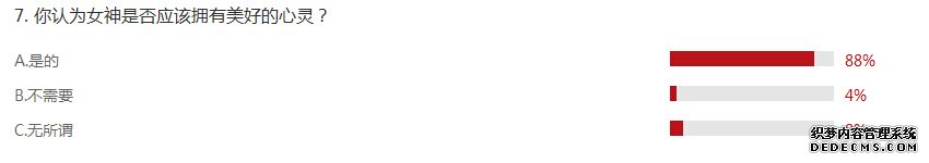 然而,即使外表看上去多么動(dòng)人,如果沒有美好的心靈,那就沒什么卵用,88%的網(wǎng)友表示女神應(yīng)該具備美好的心靈。4%的網(wǎng)友表示女神不需要美好的心靈,這一派應(yīng)該來自于的外貌協(xié)會(huì)的會(huì)員;還有8%的網(wǎng)友對(duì)此表示無所謂。