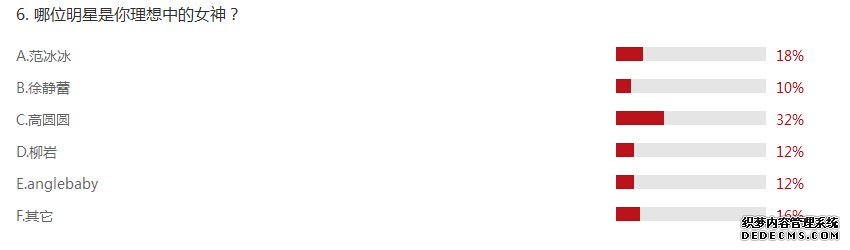 當(dāng)問及哪位明星是你理想中的女神時(shí),已經(jīng)嫁為人妻的高圓圓占據(jù)了32%網(wǎng)友的芳心,范冰冰以僅次于高圓圓的票選成為排名第二的大眾女神,另外“胸懷天下”的柳巖也俘獲了12%網(wǎng)友的芳心,剛剛大婚后就忙著去驗(yàn)?zāi)樀腷aby也撈到了12%網(wǎng)友的票選;10%的網(wǎng)友表示才女老徐才是真正的女神。還有一部分網(wǎng)友認(rèn)為“外國的月亮比較圓”,嘉寶、安吉娜朱莉、宋智孝等國外女星成為心目中的最佳女神人選。