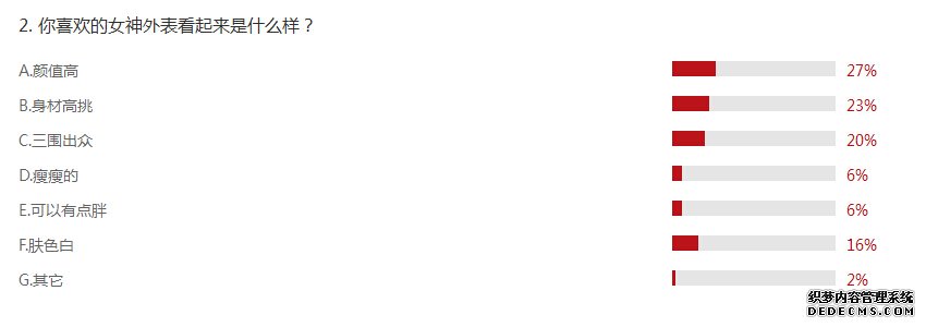 第二個(gè)問題應(yīng)該是大家最關(guān)注的話題,啥子外表才是女神LOOK?顏值高、身材苗條、三圍出眾這三項(xiàng)可謂是女神的標(biāo)配,其中最最最重要的一項(xiàng)是“顏值高”,現(xiàn)在果然是一個(gè)看臉的年代,或者說自古以來就是看臉的年代……總結(jié)起來,如果妳漂亮、高、瘦,再加上三圍出眾,憑這幾點(diǎn)基本上就可以征服所有秦皇島的男人了。6%網(wǎng)友表示心目中的女神可以有點(diǎn)胖,所以說那些微胖界的女孩不用氣餒,只要找到合適的人,微胖也可以做女神!