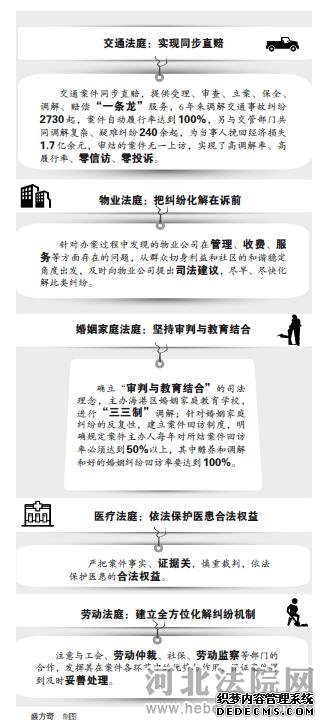 河北省秦皇島市中級人民法院提出為京津冀協(xié)調(diào)發(fā)展提供法律服務(wù)和法律保障的要求后,秦皇島市海港區(qū)人民法院認真總結(jié)以往專業(yè)法庭建設(shè)的經(jīng)驗,更新司法理念,進一步加強專業(yè)法庭建設(shè),充分發(fā)揮專業(yè)法庭的作用,讓專業(yè)法庭在服務(wù)和保障京津冀協(xié)調(diào)發(fā)展中“挑大梁”。 交通法庭:實現(xiàn)同步直賠 2009年7月,海港區(qū)人民法院交通法庭正式掛牌成立。為使大量交通事故糾紛能得到及時處理,交通法庭變事后理賠為同步直賠,即將交通法庭設(shè)在交管部門,如行政調(diào)解不成功,當(dāng)事人可當(dāng)場到交通法庭申請訴前保全、訴前調(diào)解等,實現(xiàn)了從受理、審查、立案、保全、調(diào)解、賠償?shù)?ldquo;一條龍”服務(wù)。對一些較復(fù)雜的交通事故糾紛,交通法庭提前介入,協(xié)助交管部門在證據(jù)收集、事故責(zé)任認定等方面把好關(guān)。理賠是關(guān)鍵環(huán)節(jié),海港區(qū)法院與秦皇島市保險協(xié)會建立了保險合同糾紛聯(lián)合調(diào)解機制,全市三十多家保險公司各設(shè)一名專職調(diào)解員,其中五大保險公司輪流在交通法庭值班,其他保險公司調(diào)解員隨叫隨到。一旦發(fā)生糾紛,保險公司調(diào)解員會在第一時間介入案件理賠工作,及時核算,及時理賠。 徐某駕駛的大型客車與馮某駕駛的大貨車相撞,造成大型客車乘員關(guān)某當(dāng)場死亡,另有21人不同程度受傷。交管部門認定徐某承擔(dān)此次事故的全部責(zé)任。由于案情復(fù)雜,交管部門將案件移交給交通法庭。交通法庭接收案件后,在做好死者親屬及受傷人員安撫工作的同時,馬上開展傷殘評定、損失核算等項工作,保險公司調(diào)解員也積極參與。最后,交通法庭僅用一天時間就調(diào)解解決了這起重大交通事故糾紛,保險公司也當(dāng)即兌現(xiàn)了理賠。這起糾紛如經(jīng)訴訟程序?qū)徖?,至少要花費幾個月時間,而交通法庭僅用5天時間就在訴前成功化解,死者親屬、傷者及肇事方都非常滿意。 6年來,交通法庭共調(diào)解交通事故糾紛2730起,案件自動履行率達到100%,另與交管部門共同調(diào)解復(fù)雜、疑難糾紛240余起,為當(dāng)事人挽回經(jīng)濟損失1.7億余元。6年來,交通法庭審結(jié)的案件無一上訪,實現(xiàn)了高調(diào)解率、高履行率、零信訪、零投訴。 物業(yè)法庭:把糾紛化解在訴前 近年來,海港區(qū)法院受理的物業(yè)糾紛數(shù)量逐年上升,幅度達30%以上。物業(yè)糾紛不僅關(guān)系到群眾的切身利益,更關(guān)系到社區(qū)的和諧和穩(wěn)定,化解此類糾紛宜早不宜晚,宜快不宜遲。鑒于這種情況,該院于去年4月成立了全市第一個物業(yè)法庭。 業(yè)主戴某自2011年1月至2013年12月未交納物業(yè)費,共欠費2487元。接到物業(yè)公司的起訴后,征得雙方同意,物業(yè)法庭進行了訴前調(diào)解。戴某稱:“我家車輛停放在小區(qū)內(nèi)四次被劃,找到物業(yè)公司查看監(jiān)控,監(jiān)控不清楚,到現(xiàn)在也沒有找到侵權(quán)人。我認為物業(yè)公司保安沒有盡到保安義務(wù),應(yīng)當(dāng)給我賠償修車的費用。不賠就不繳納物業(yè)費。”物業(yè)公司則稱:“車被劃不是我公司造成的,我公司不應(yīng)該承擔(dān)修車的責(zé)任。”辦案法官向戴某說明:“物業(yè)公司有義務(wù)提供線索協(xié)助公安部門破案,但是要求物業(yè)公司承擔(dān)賠償責(zé)任理由不足。如業(yè)主有證據(jù)證明物業(yè)公司在服務(wù)及管理方面存在過錯,物業(yè)公司應(yīng)根據(jù)過錯程度承擔(dān)責(zé)任。你說物業(yè)公司未盡到安全保障義務(wù),但沒有提供證據(jù)證明物業(yè)公司存在過錯,所以應(yīng)交納拖欠的物業(yè)費。對于車輛損失,業(yè)主可以向侵權(quán)人主張合法權(quán)利。”經(jīng)調(diào)解,業(yè)主轉(zhuǎn)變了態(tài)度,主動繳納了拖欠的2487元物業(yè)費。 物業(yè)法庭在辦案中發(fā)現(xiàn),有的物業(yè)公司缺乏客戶意識,向業(yè)主收費時冷、橫、硬,引起業(yè)主不滿;有的物業(yè)公司重收費、輕服務(wù),對業(yè)主正當(dāng)要求不能及時滿足;有的物業(yè)公司管理不規(guī)范,沒有和業(yè)主簽訂物業(yè)服務(wù)合同。發(fā)現(xiàn)這些問題后,物業(yè)法庭及時向物業(yè)公司提出司法建議。 某小區(qū)30多家業(yè)主拖欠物業(yè)費,物業(yè)公司起訴到物業(yè)法庭。業(yè)主們則反映,物業(yè)公司管理不到位,管理服務(wù)人員少,而且沒有與業(yè)主簽訂物業(yè)服務(wù)合同,收費標(biāo)準也不統(tǒng)一。物業(yè)法庭經(jīng)核實后建議物業(yè)公司:增加管理服務(wù)人員;和業(yè)主簽訂書面物業(yè)服務(wù)合同。物業(yè)公司接受了物業(yè)法庭的建議,馬上增加了管理服務(wù)人員,并著手做與業(yè)主簽訂物業(yè)服務(wù)合同的準備工作。經(jīng)調(diào)解,物業(yè)公司將以前的收費標(biāo)準降低了20%,業(yè)主們也陸續(xù)補交了物業(yè)費。 婚姻家庭法庭:堅持審判與教育結(jié)合 長城人民法庭成立于1985年,從1998開始,該庭專門審理轄區(qū)內(nèi)的婚姻家庭糾紛,因此該庭又被稱為婚姻家庭法庭。 早在1998年,該庭就確立了“審判與教育結(jié)合”的司法理念,并主辦了海港區(qū)