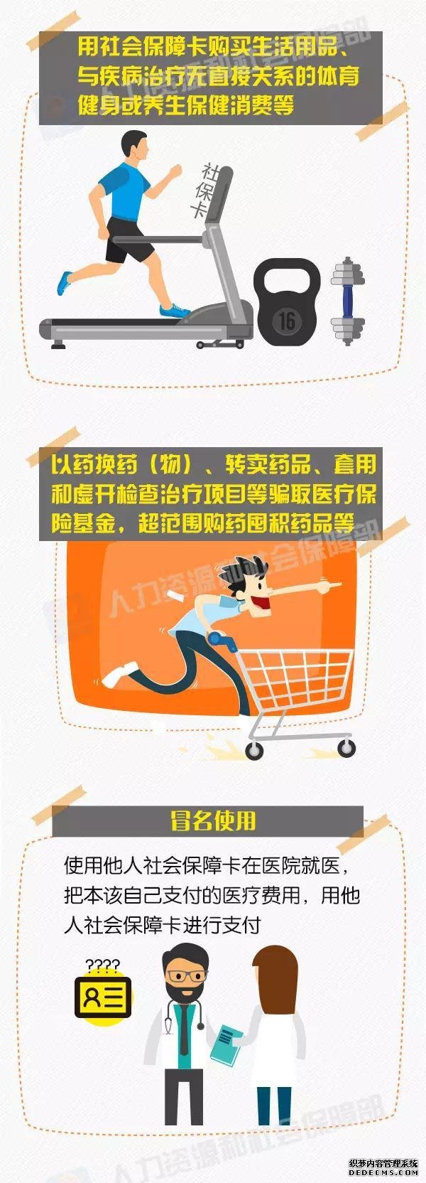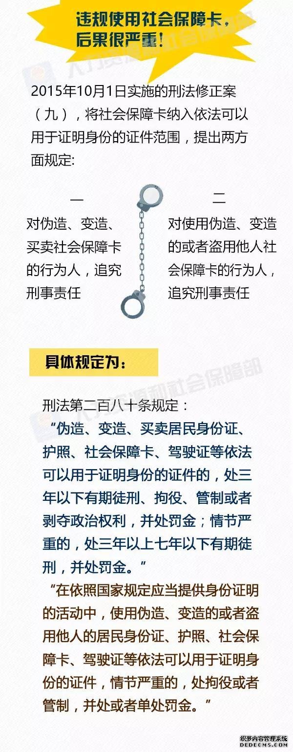 社會保障卡是持卡人享受人力資源和社會保障權(quán)益的信息載體,具有身份憑證、信息記錄、自助查詢、就醫(yī)結(jié)算、繳費和待遇領(lǐng)取等社會保障應(yīng)用功能,以及現(xiàn)金存取、轉(zhuǎn)賬、消費等金融應(yīng)用功能。 一卡在手,走遍天下不愁,是對社會保障卡的形象描述。 但是你知道嗎?如果參保人員違反基本醫(yī)療保險等規(guī)定,可能會被暫停使用社會保障卡,受到行政處罰,甚至追究刑事責(zé)任。 哪些情況是違規(guī)的呢?一起來看——