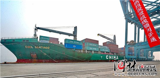 10月27日,菲律賓達(dá)沃至秦皇島直航航線首航儀式在秦皇島港舉行。圖為中海圣地亞哥號輪船。 10月26日晚,由菲律賓沃達(dá)港起航的第一艘集裝箱班輪,中國香港籍中海圣地亞哥(CSCLSANTIAGO)號靠泊在秦皇島港集裝箱碼頭,該輪由菲律賓裝運的53個集裝箱約106噸香蕉進(jìn)港。 菲律賓達(dá)沃至秦皇島直航航線是秦皇島港第8條集裝箱班輪航線,由菲律賓達(dá)沃港直達(dá)秦皇島港,返程時經(jīng)由青島、上海、寧波、福州、蛇口、雅加達(dá)、泗水抵達(dá)達(dá)沃,每周一班。該航線由4條2500TEU(標(biāo)準(zhǔn)集裝箱)船舶運行,每條船舶有500個冷藏集裝箱艙位。